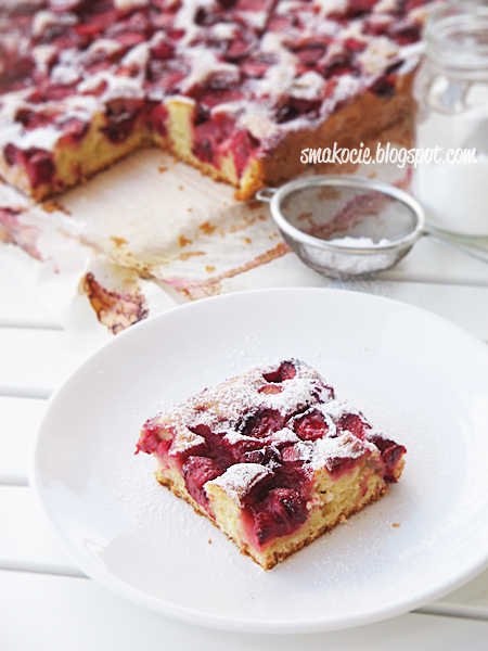 Piekarnik rozgrzej do temperatury 180'C. Masło i cukier ucieraj mikserem przez około 5 minut. Ja użyłam cukru brązowego, który nie do końca chciał się rozpuścić, ale nie przejmowałam się tym i kontynuowałam przyrządzanie ciasta. Po tym czasie dodaj jajka i ubijaj jeszcze przez 2 minuty - masa nabierze puszystości. Dodaj mąkę wymieszaną z proszkiem do pieczenia oraz śmietanę - wymieszaj. Masę przełóż do prostokątnej blaszki i rozprowadź równomiernie. Wierzch ciasta posyp pokrojonymi owocami. Piecz około 40 minut. Lekko przestudzone ciasto udekoruj cukrem pudrem.